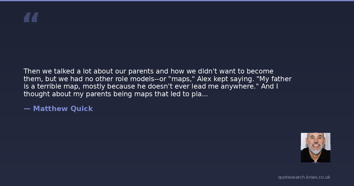 Then we talked a lot about our parents and how we didn't want to become them, but we had no other role models--or "maps," Alex kept saying. "My father is a terrible map, mostly because he doesn't ever lead me anywhere." And I thought about my parents being maps that led to places I didn't want to go-- and it made a shocking amount of sense, using the word maps to describe parents. If almost made you feel like you could fold Mom and Dad up and lock them away in the glove compartment of your car and just joyride for the rest of your life maybe.