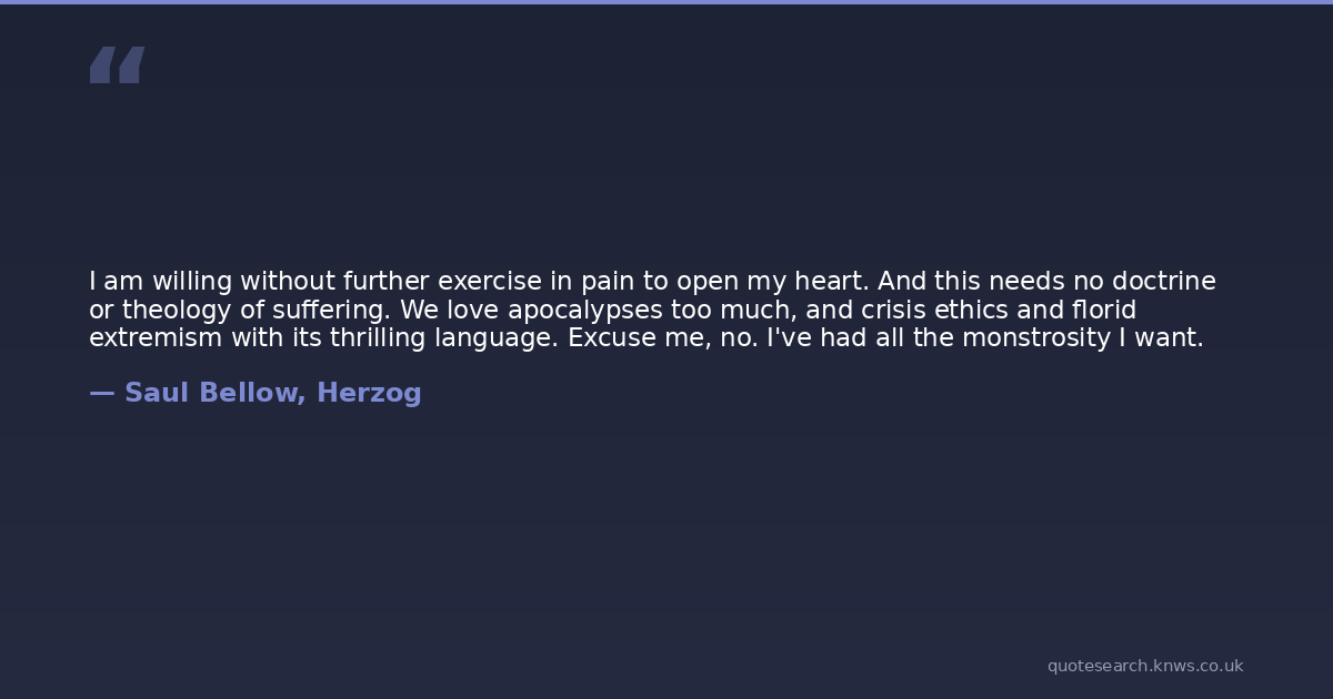 I am willing without further exercise in pain to open my heart. And this needs no doctrine or theology of suffering. We love apocalypses too much, and crisis ethics and florid extremism with its thrilling language. Excuse me, no. I've had all the monstrosity I want.