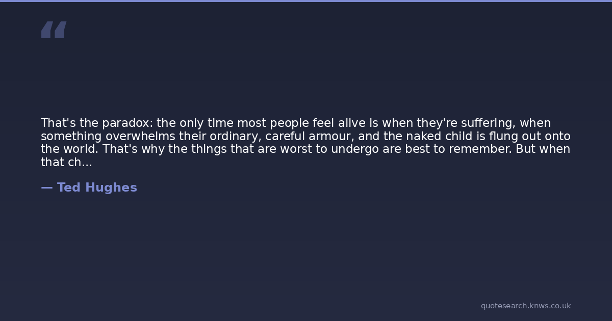 That's the paradox: the only time most people feel alive is when they're suffering, when something overwhelms their ordinary, careful armour, and the naked child is flung out onto the world. That's why the things that are worst to undergo are best to remember. But when that child gets buried away under their adaptive and protective shellshe becomes one of the walking dead, a monster.