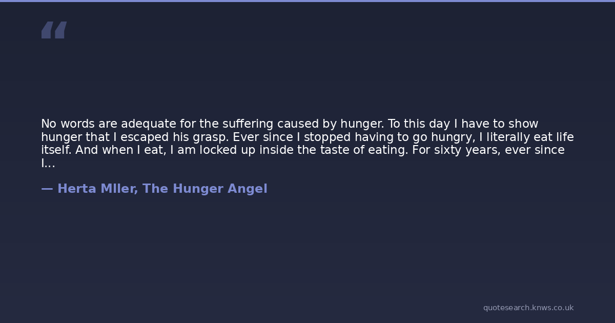 No words are adequate for the suffering caused by hunger. To this day I have to show hunger that I escaped his grasp. Ever since I stopped having to go hungry, I literally eat life itself. And when I eat, I am locked up inside the taste of eating. For sixty years, ever since I came back from the camp, I have been eating against starvation.