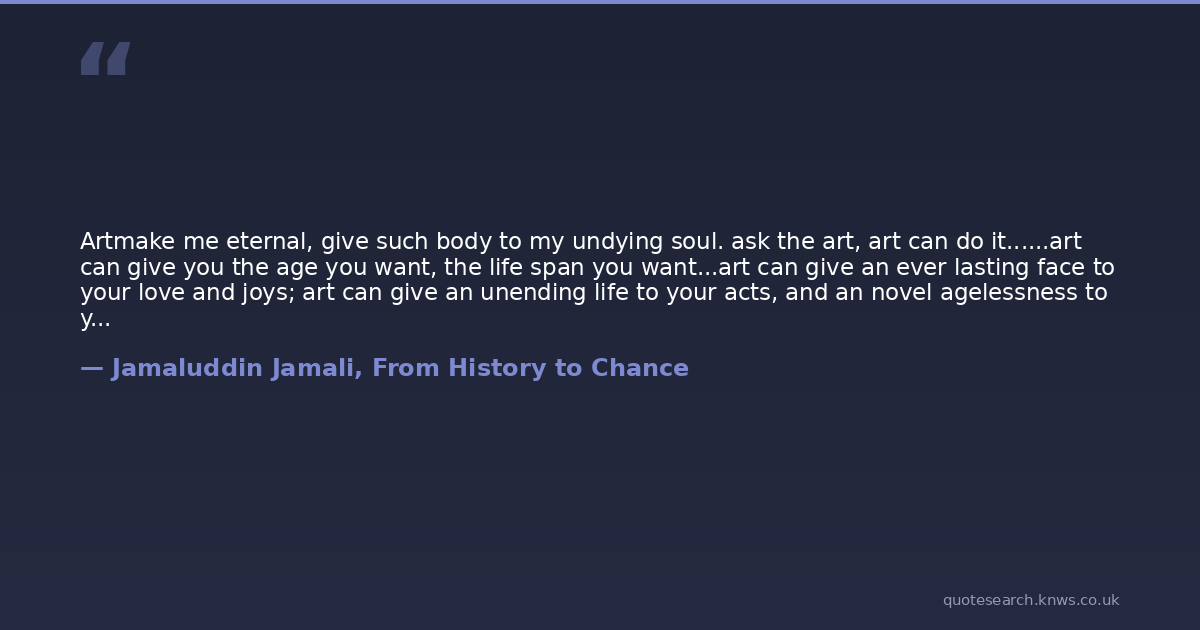 Artmake me eternal, give such body to my undying soul. ask the art, art can do it......art can give you the age you want, the life span you want...art can give an ever lasting face to your love and joys; art can give an unending life to your acts, and an novel agelessness to your intercourse with this life that you love and we love...we all. Love, that too is Art and fill your memory yard with its art exhibitions....