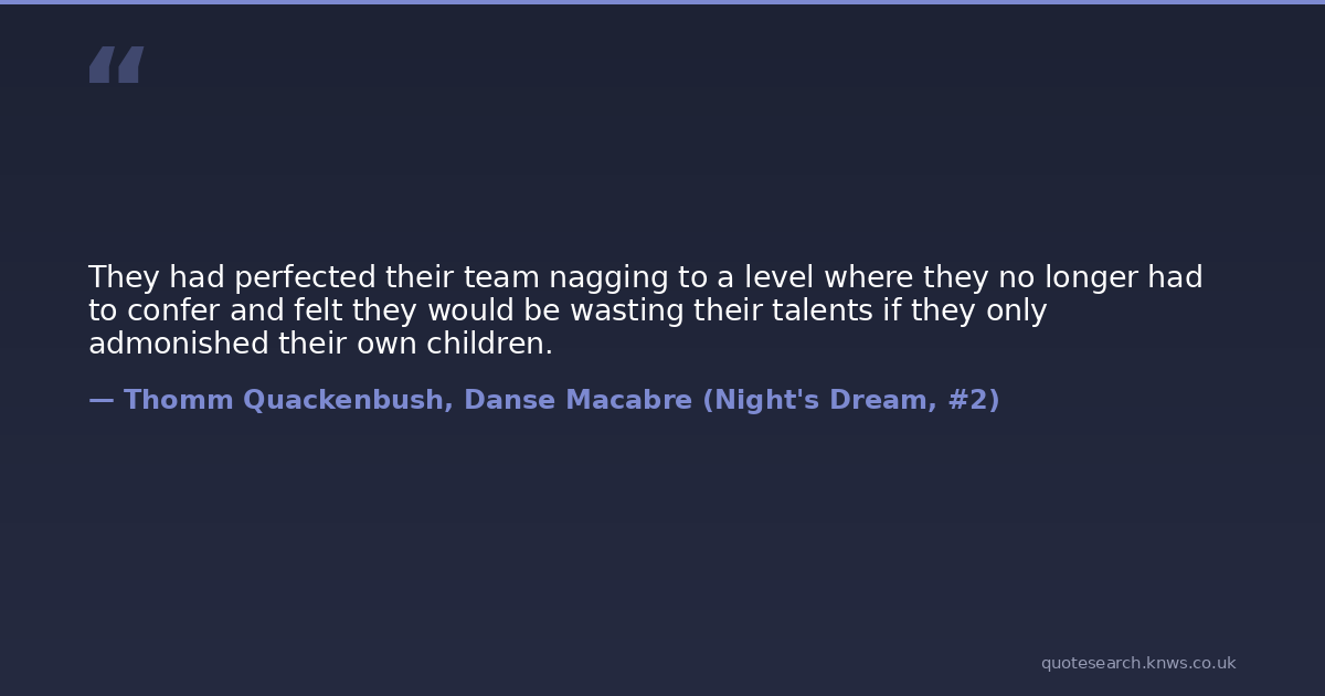 They had perfected their team nagging to a level where they no longer had to confer and felt they would be wasting their talents if they only admonished their own children.