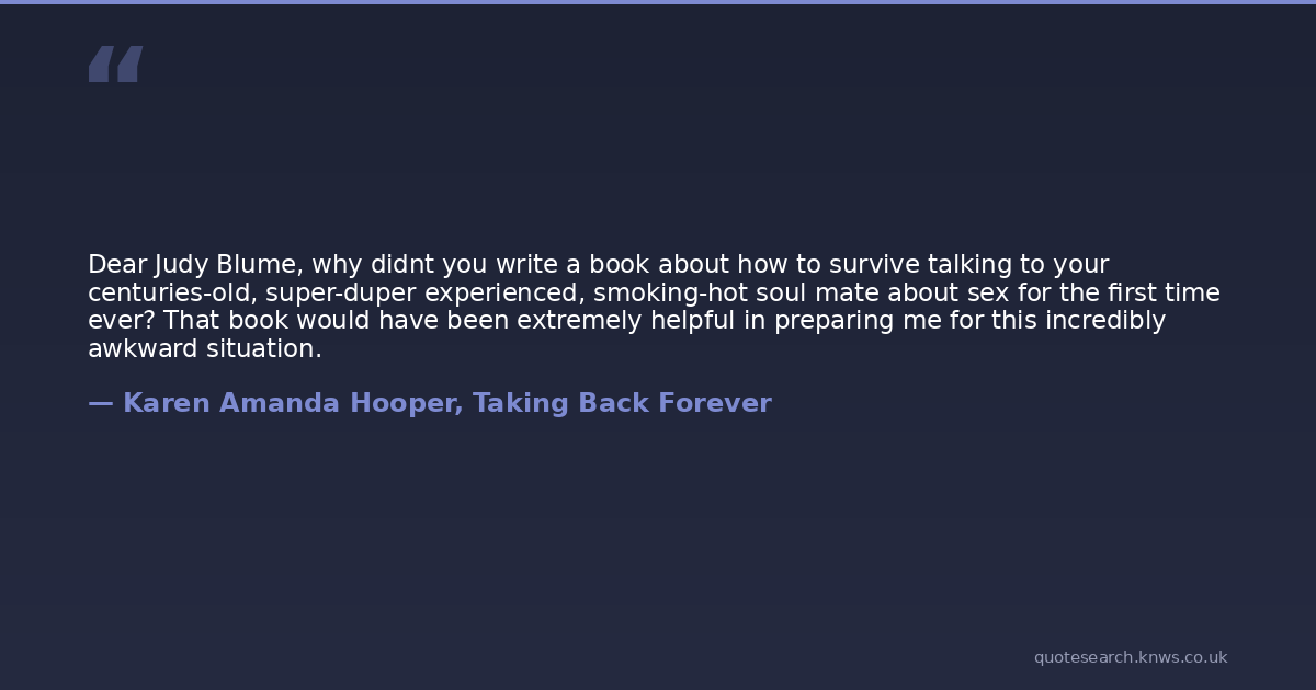 Dear Judy Blume, why didnt you write a book about how to survive talking to your centuries-old, super-duper experienced, smoking-hot soul mate about sex for the first time ever? That book would have been extremely helpful in preparing me for this incredibly awkward situation.