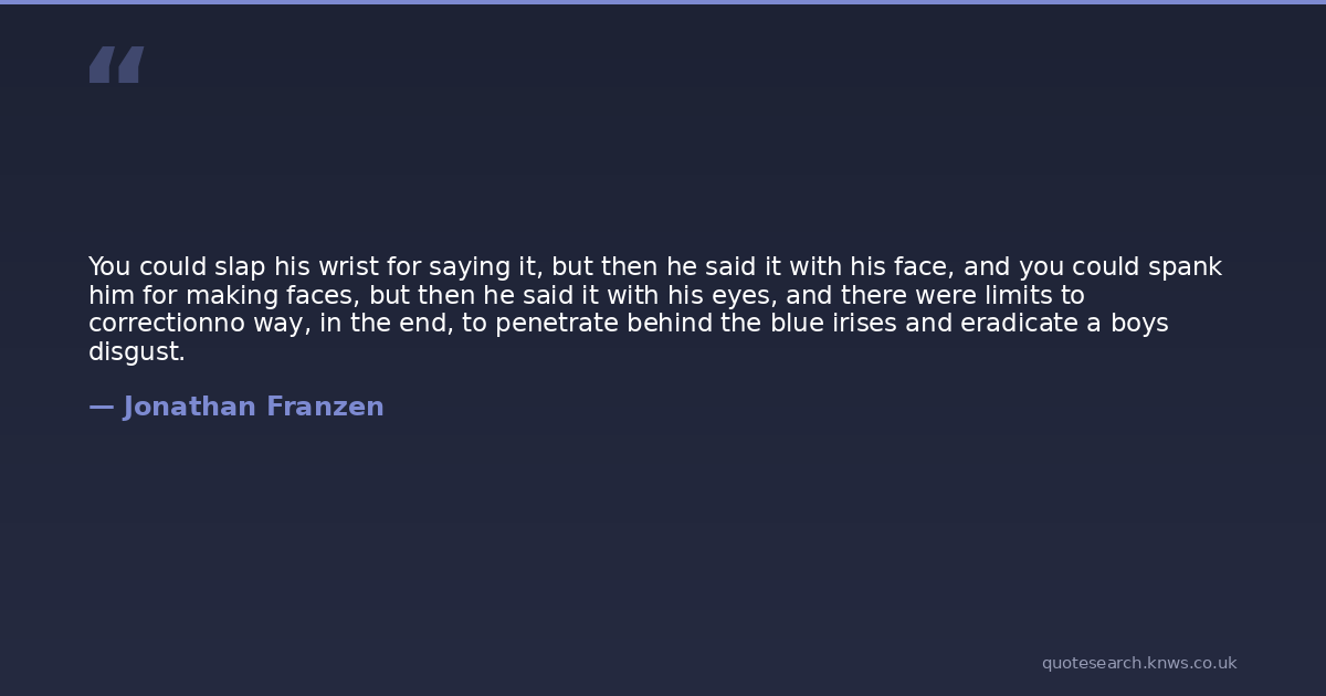 You could slap his wrist for saying it, but then he said it with his face, and you could spank him for making faces, but then he said it with his eyes, and there were limits to correctionno way, in the end, to penetrate behind the blue irises and eradicate a boys disgust.