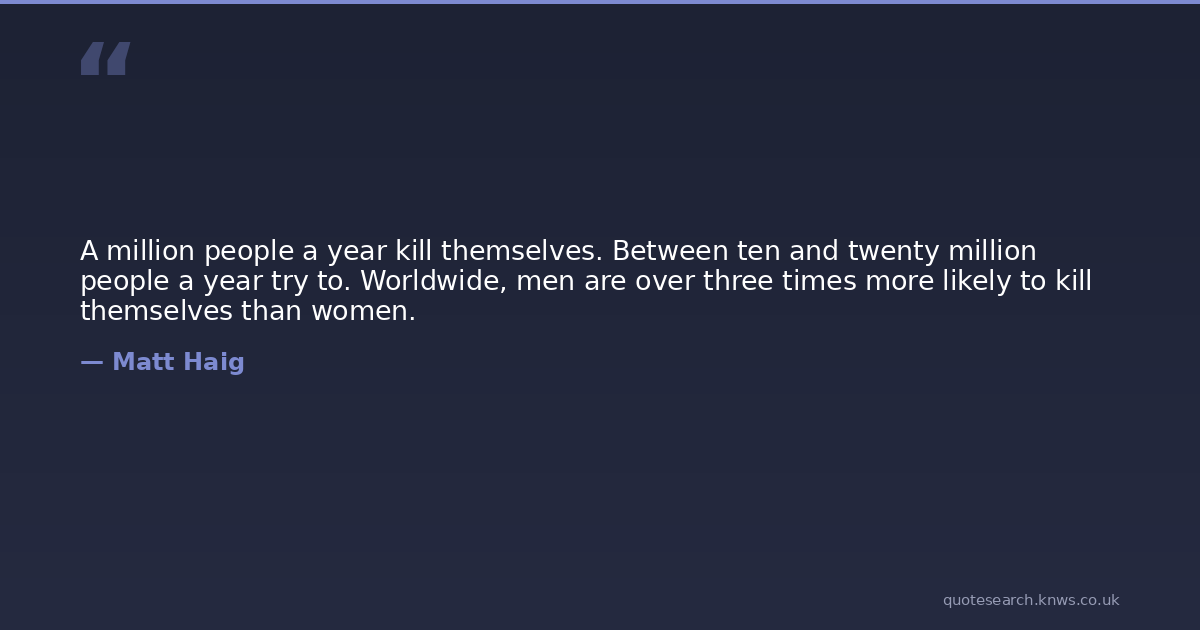 A million people a year kill themselves. Between ten and twenty million people a year try to. Worldwide, men are over three times more likely to kill themselves than women.