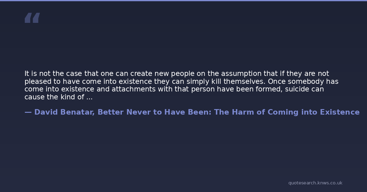 It is not the case that one can create new people on the assumption that if they are not pleased to have come into existence they can simply kill themselves. Once somebody has come into existence and attachments with that person have been formed, suicide can cause the kind of pain that makes the pain of childlessness mild by comparison. Somebody contemplating suicide knows (or should know) this. This places an important obstacle in the way of suicide. Ones life may be bad, but one must consider what affect ending it would have on ones family and friends. There will be times when life has become so bad that it is unreasonable for the interests of the loved ones in having the person alive to outweigh that persons interests in ceasing to exist. When this is true will depend in part on particular features of the person for whom continued life is a burden. Different people are able to bear different magnitudes of burden. It may even be indecent for family members to expect that person to continue living. On other occasions ones life may be bad but not so bad as to warrant killing oneself and thereby making the lives of ones family and friends still much worse than they already are.