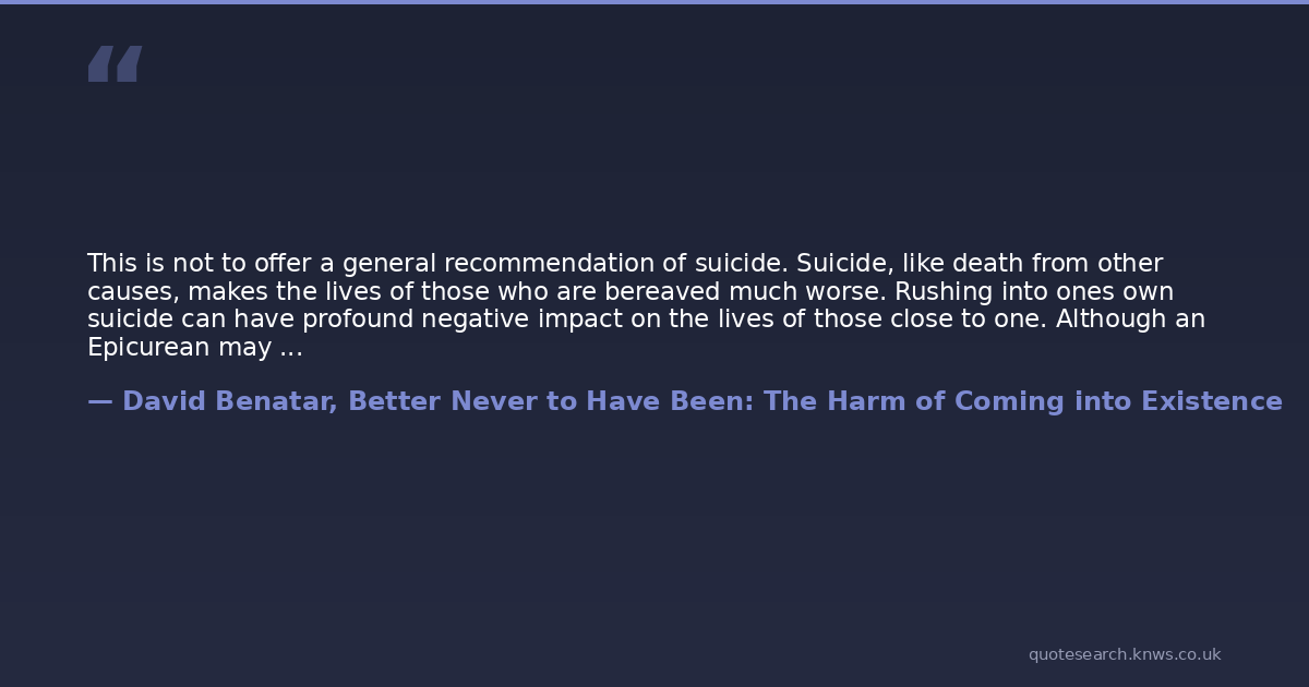 This is not to offer a general recommendation of suicide. Suicide, like death from other causes, makes the lives of those who are bereaved much worse. Rushing into ones own suicide can have profound negative impact on the lives of those close to one. Although an Epicurean may be committed to not caring about whathappens after his death, it is still the case that the bereaved suffer a harm even if the deceased does not. That suicide harms those who are thereby bereaved is part of the tragedy of coming into existence. We find ourselves in a kind of trap. We have already come into existence. To end our existence causes immense pain to those we love and for whom we care. Potential procreators would do well to consider this trap they lay when they produce offspring.