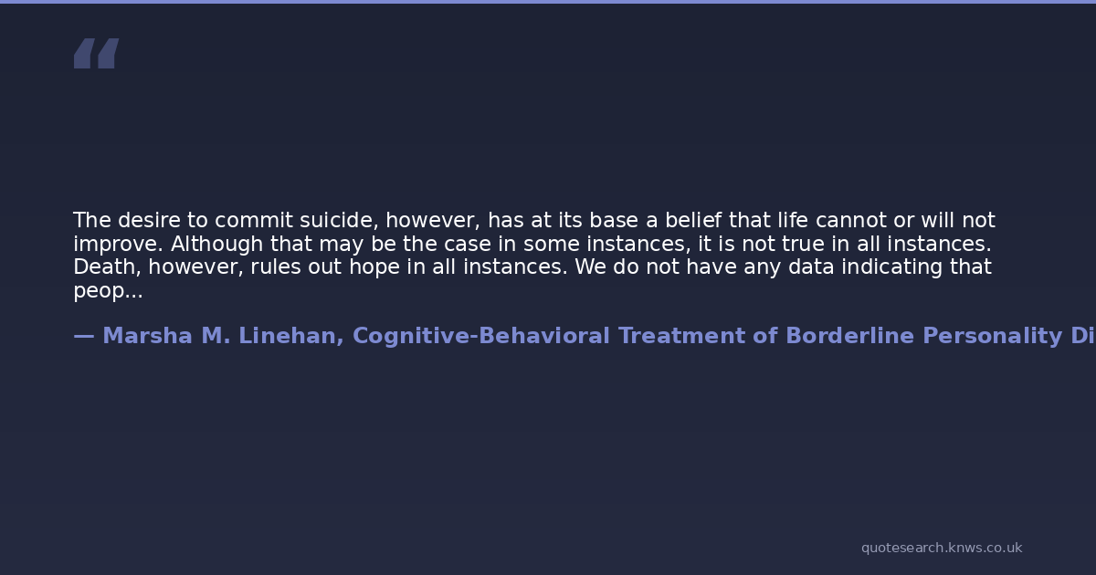 The desire to commit suicide, however, has at its base a belief that life cannot or will not improve. Although that may be the case in some instances, it is not true in all instances. Death, however, rules out hope in all instances. We do not have any data indicating that people who are dead lead better lives.