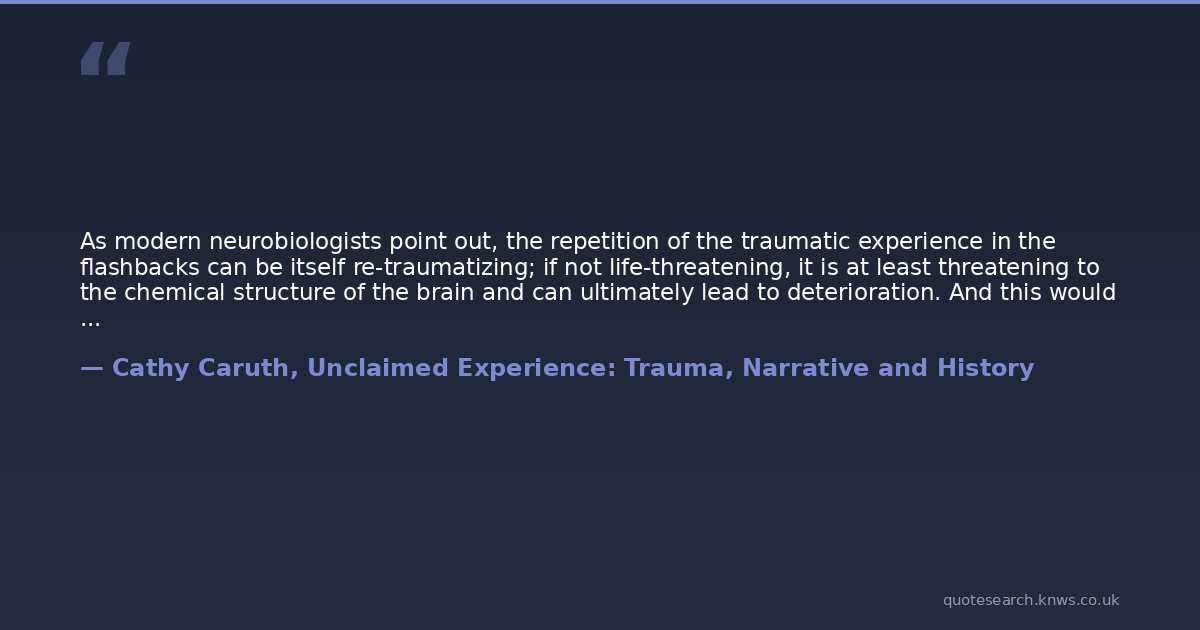 As modern neurobiologists point out, the repetition of the traumatic experience in the flashbacks can be itself re-traumatizing; if not life-threatening, it is at least threatening to the chemical structure of the brain and can ultimately lead to deterioration. And this would also seem to explain the high suicide rate of survivor, for example, survivors of Vietnam.