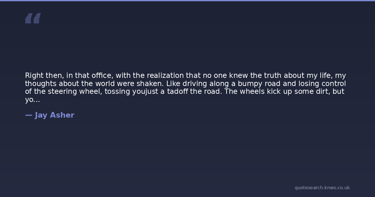 Right then, in that office, with the realization that no one knew the truth about my life, my thoughts about the world were shaken. Like driving along a bumpy road and losing control of the steering wheel, tossing youjust a tadoff the road. The wheels kick up some dirt, but youre able to pull it back. Yet no matter how tightly you grip the wheel, no matter how hard you try to drive straight, something keeps jerking you to the side. You have so little control over anything anymore. And at some point, the struggle becomes too muchtoo tiringand you consider letting go. Allowing tragedy . . . or whatever . . . to happen.