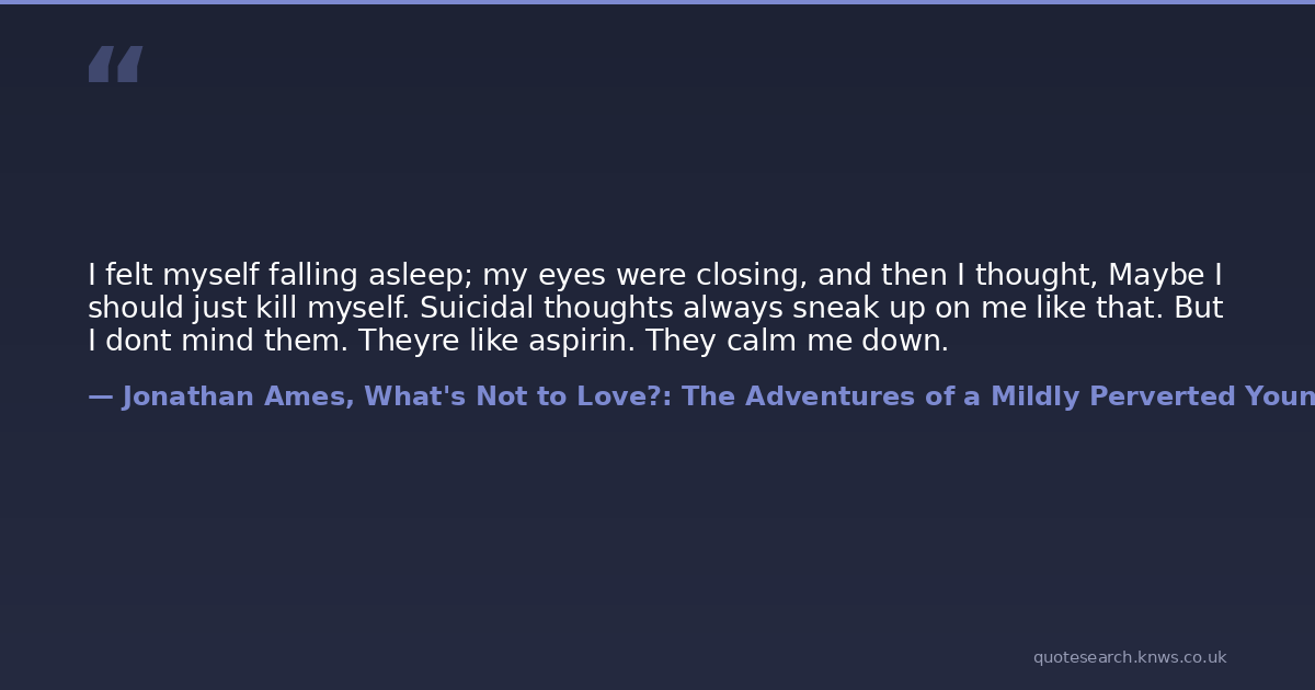 I felt myself falling asleep; my eyes were closing, and then I thought, Maybe I should just kill myself. Suicidal thoughts always sneak up on me like that. But I dont mind them. Theyre like aspirin. They calm me down.