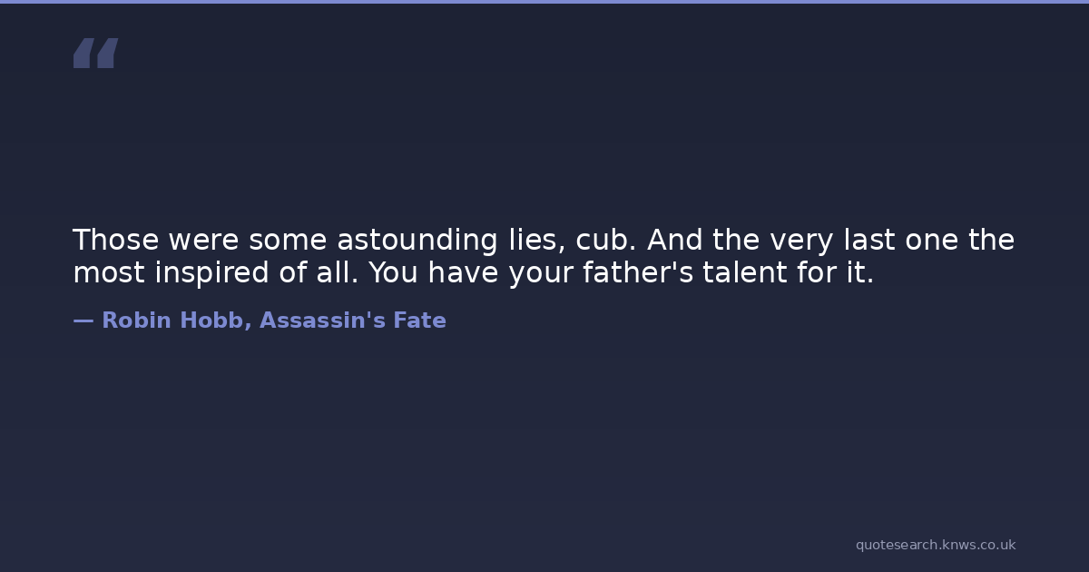 Those were some astounding lies, cub. And the very last one the most inspired of all. You have your father's talent for it.