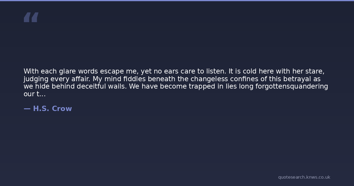 With each glare words escape me, yet no ears care to listen. It is cold here with her stare, judging every affair. My mind fiddles beneath the changeless confines of this betrayal as we hide behind deceitful wails. We have become trapped in lies long forgottensquandering our time in lunacy with the thought of what was and is no more.