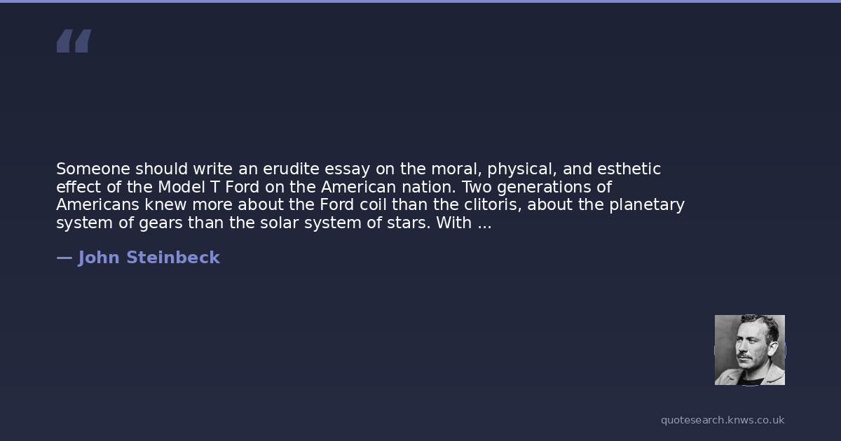 Someone should write an erudite essay on the moral, physical, and esthetic effect of the Model T Ford on the American nation. Two generations of Americans knew more about the Ford coil than the clitoris, about the planetary system of gears than the solar system of stars. With the Model T, part of the concept of private property disappeared. Pliers ceased to be privately owned and a tire pump belonged to the last man who had picked it up. Most of the babies of the period were conceived in Model T Fords and not a few were born in them. The theory of the Anglo Saxon home became so warped that it never quite recovered.
