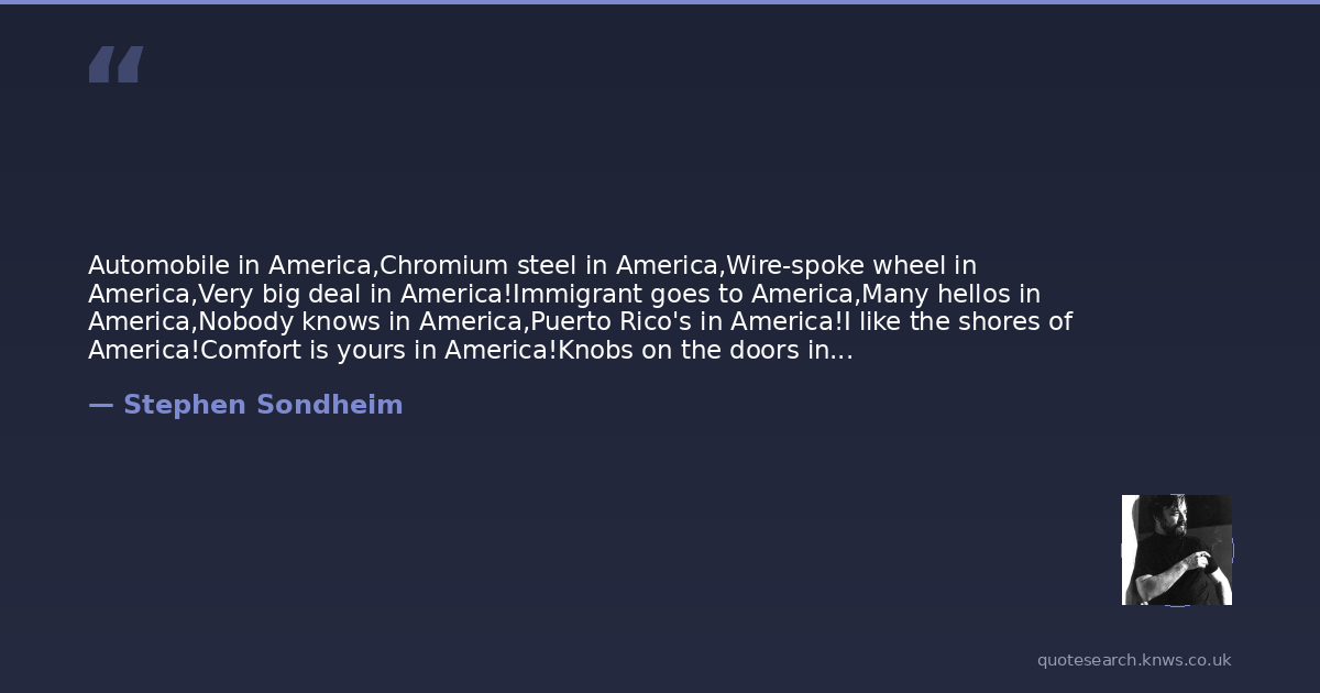 Automobile in America,Chromium steel in America,Wire-spoke wheel in America,Very big deal in America!Immigrant goes to America,Many hellos in America,Nobody knows in America,Puerto Rico's in America!I like the shores of America!Comfort is yours in America!Knobs on the doors in America!Wall-to-wall floors in America!