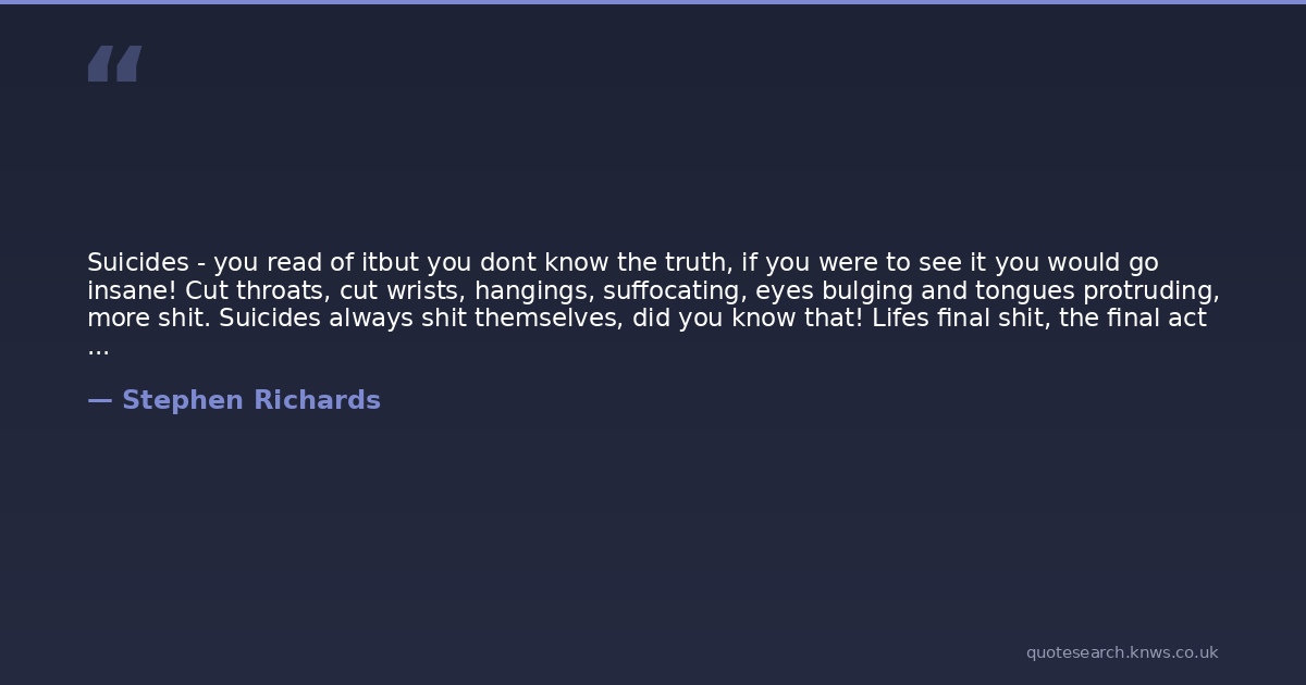 Suicides - you read of itbut you dont know the truth, if you were to see it you would go insane! Cut throats, cut wrists, hangings, suffocating, eyes bulging and tongues protruding, more shit. Suicides always shit themselves, did you know that! Lifes final shit, the final act of madness; smell that you rats! Clean me up you pigs, zip me up in the bag you scum and get me out of here Get me the fuck out of hereget me out!