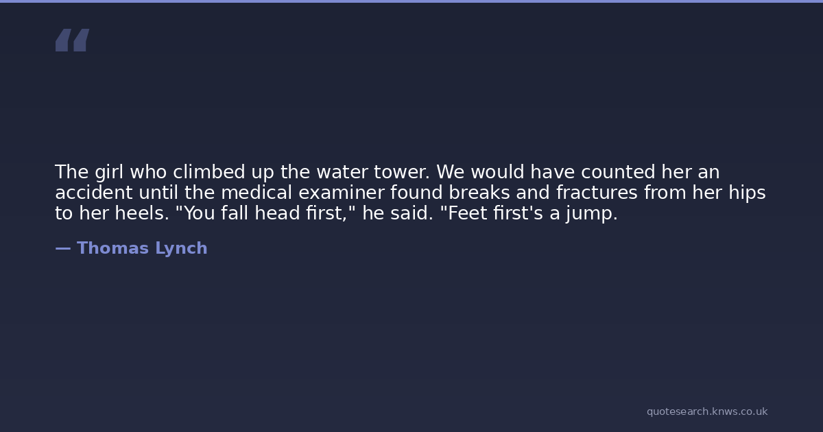 The girl who climbed up the water tower. We would have counted her an accident until the medical examiner found breaks and fractures from her hips to her heels. "You fall head first," he said. "Feet first's a jump.