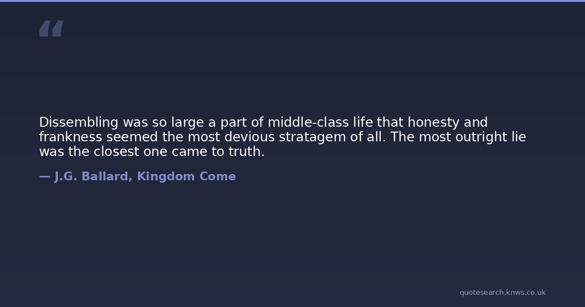 Dissembling was so large a part of middle-class life that honesty and frankness seemed the most devious stratagem of all. The most outright lie was the closest one came to truth.