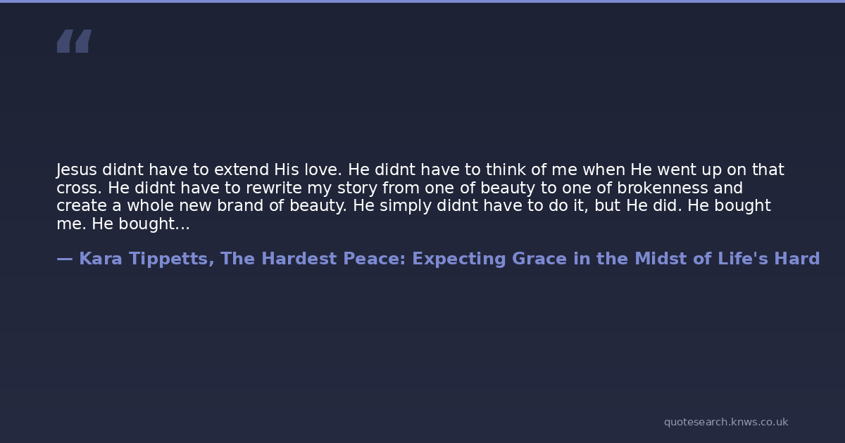 Jesus didnt have to extend His love. He didnt have to think of me when He went up on that cross. He didnt have to rewrite my story from one of beauty to one of brokenness and create a whole new brand of beauty. He simply didnt have to do it, but He did. He bought me. He bought me that day He died, and He showed His power when He overcame death and rose from the grave. He overcame my death in that moment. He overcame my fear of death in that unbelievable, beautiful moment, and the fruit of that death, that resurrection, and that stunning grace is peace. It is the hardest peace, because it is brutal. Horribly brutal and ugly, and we want to look away, but it is the greatest, greatest story that ever was. And it was, and it is.