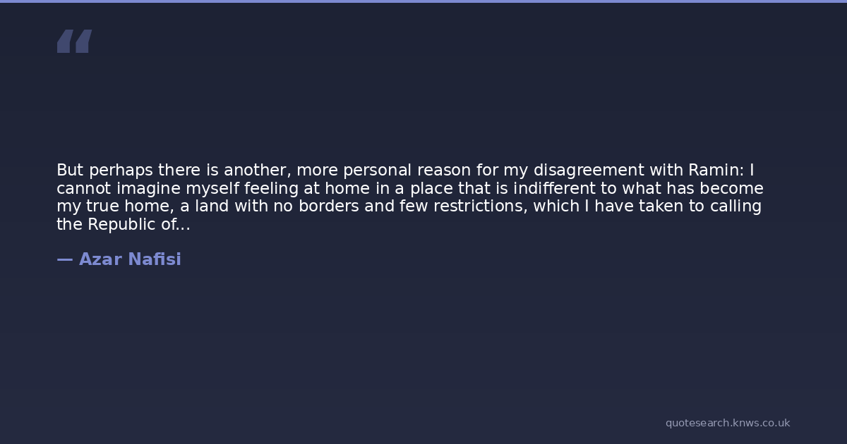 But perhaps there is another, more personal reason for my disagreement with Ramin: I cannot imagine myself feeling at home in a place that is indifferent to what has become my true home, a land with no borders and few restrictions, which I have taken to calling the Republic of Imagination. I think of it as Nabokovs somehow, somewhere or Alices backyard, a world that runs parallel to the real one, whose occupants need no passport or documentation. The only requirements for entry are an open mind, a restless desire to know and an indefinable urge to escape the mundane.