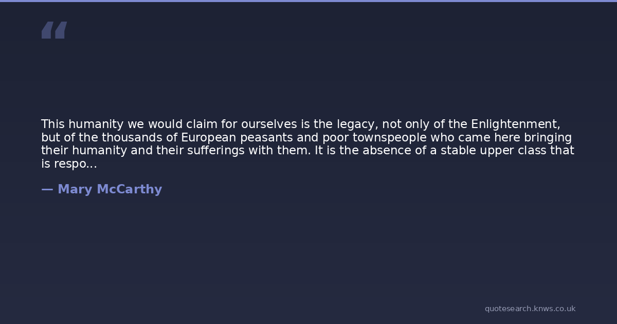 This humanity we would claim for ourselves is the legacy, not only of the Enlightenment, but of the thousands of European peasants and poor townspeople who came here bringing their humanity and their sufferings with them. It is the absence of a stable upper class that is responsible for much of the vulgarity of the American scene. Should we blush before the visitor for this deficiency? The ugliness of American decoration, American entertainment, American literature - is not this the visible expression of the impoverishment of the European masses, a manifestation of all the backwardness, deprivation, and want that arrived here in boatloads from Europe? The immense popularity of American movies abroad demonstrates that Europe is the unfinished negative of which America is the proof. The European traveler, viewing with distaste a movie palace or a Motorola, is only looking into the terrible concavity of his continent of hunger inverted startlingly into the convex. Our civilization, deformed as it is outwardly, is still an accomplishment; all this had to come to light.