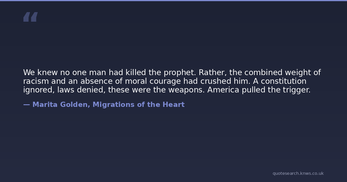 We knew no one man had killed the prophet. Rather, the combined weight of racism and an absence of moral courage had crushed him. A constitution ignored, laws denied, these were the weapons. America pulled the trigger.