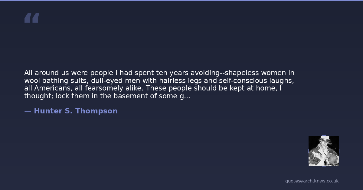 All around us were people I had spent ten years avoiding--shapeless women in wool bathing suits, dull-eyed men with hairless legs and self-conscious laughs, all Americans, all fearsomely alike. These people should be kept at home, I thought; lock them in the basement of some goddamn Elks Club and keep them pacified with erotic movies; if they want a vacation, show them a foreign art film; and if they still aren't satisfied, send them into the wilderness and run them with vicious dogs.