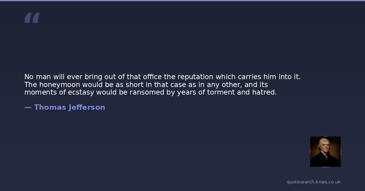 No man will ever bring out of that office the reputation which carries him into it. The honeymoon would be as short in that case as in any other, and its moments of ecstasy would be ransomed by years of torment and hatred.