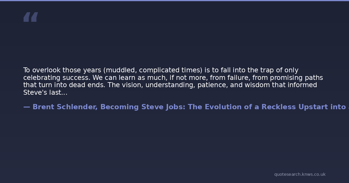 To overlook those years (muddled, complicated times) is to fall into the trap of only celebrating success. We can learn as much, if not more, from failure, from promising paths that turn into dead ends. The vision, understanding, patience, and wisdom that informed Steve's last decade were forged in the trials of these intervening years. The failures, stinging reversals, miscommunications, bad judgment calls, emphases on wrong values-the whole Pandora's box of immaturity- were necessary prerequisites to the clarity, moderation, reflection, and steadiness he would display in later years.