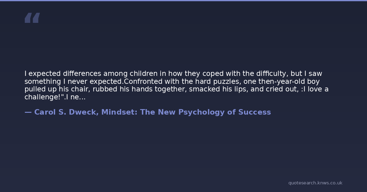 I expected differences among children in how they coped with the difficulty, but I saw something I never expected.Confronted with the hard puzzles, one then-year-old boy pulled up his chair, rubbed his hands together, smacked his lips, and cried out, :I love a challenge!".I never though anyone loved failure.Not only weren't they discouraged by failure, they didn't even think they were failing. They though they were learning.
