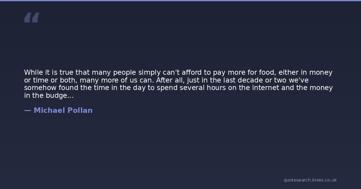 While it is true that many people simply can't afford to pay more for food, either in money or time or both, many more of us can. After all, just in the last decade or two we've somehow found the time in the day to spend several hours on the internet and the money in the budget not only to pay for broadband service, but to cover a second phone bill and a new monthly bill for television, formerly free. For the majority of Americans, spending more for better food is less a matter of ability than priority. p.187