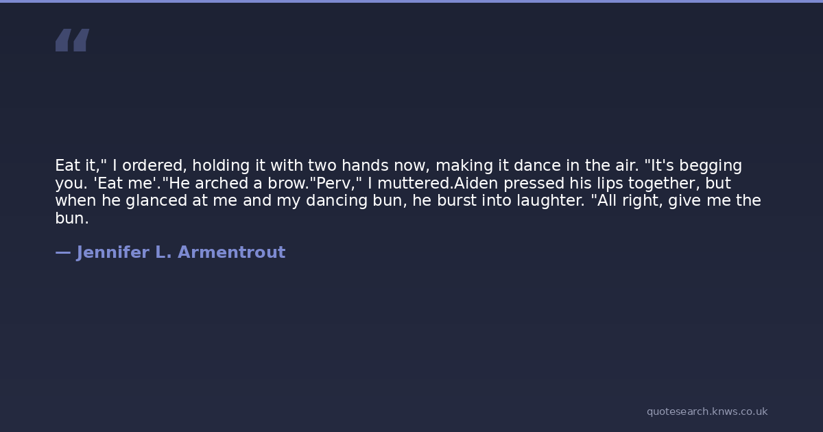 Eat it," I ordered, holding it with two hands now, making it dance in the air. "It's begging you. 'Eat me'."He arched a brow."Perv," I muttered.Aiden pressed his lips together, but when he glanced at me and my dancing bun, he burst into laughter. "All right, give me the bun.