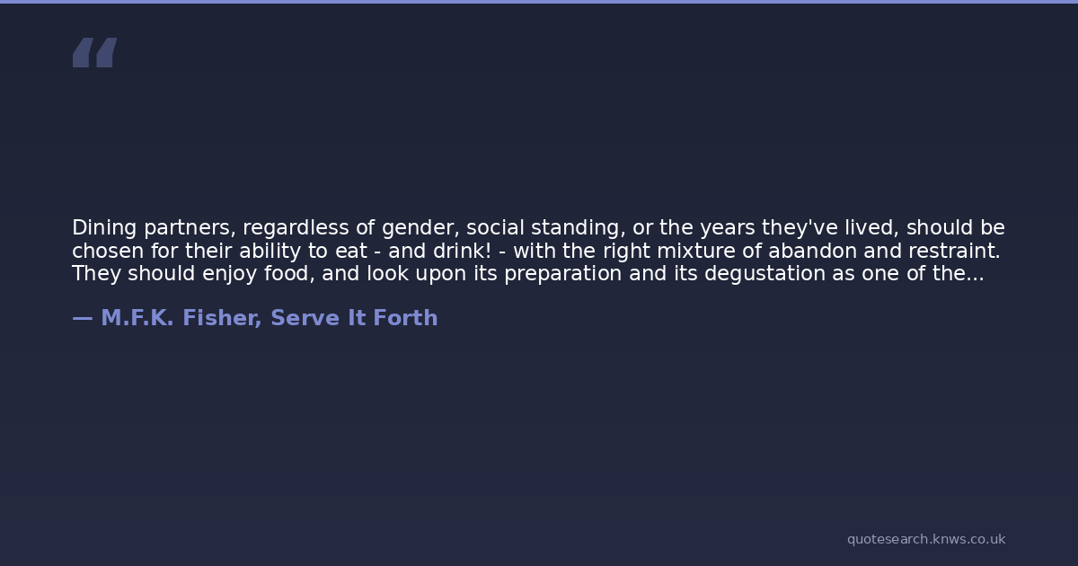 Dining partners, regardless of gender, social standing, or the years they've lived, should be chosen for their ability to eat - and drink! - with the right mixture of abandon and restraint. They should enjoy food, and look upon its preparation and its degustation as one of the human arts.