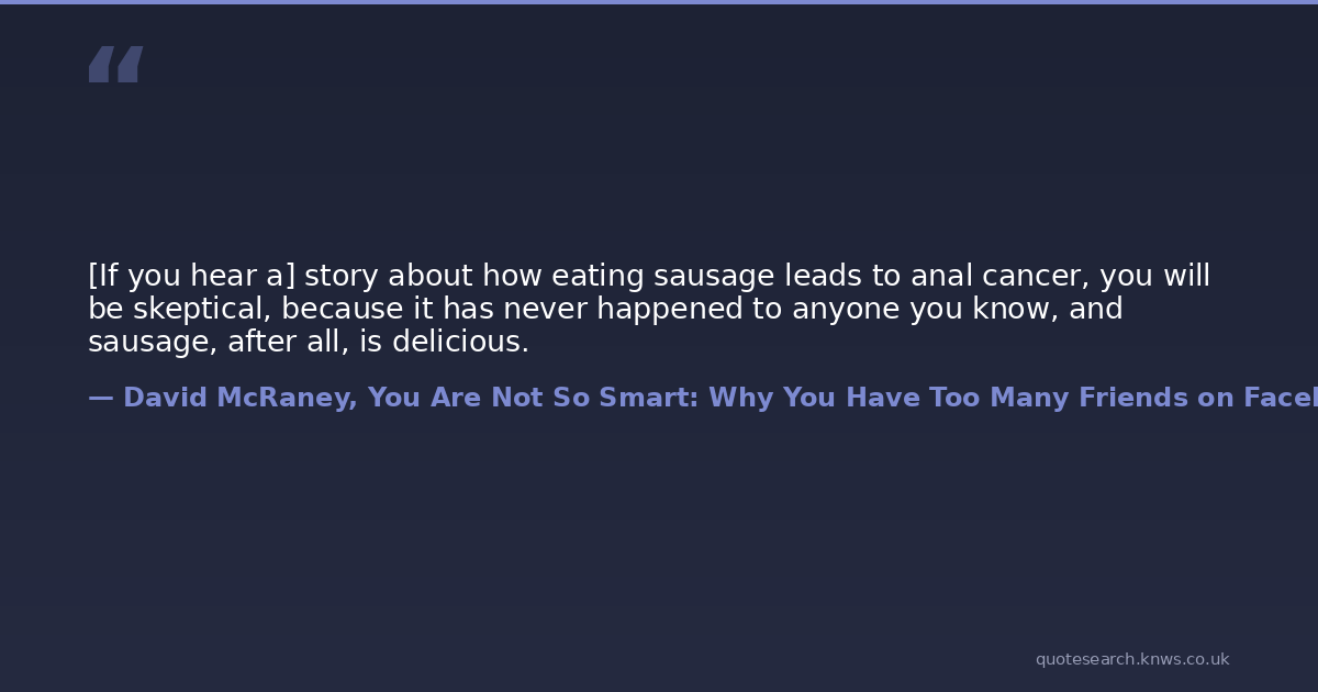 [If you hear a] story about how eating sausage leads to anal cancer, you will be skeptical, because it has never happened to anyone you know, and sausage, after all, is delicious.