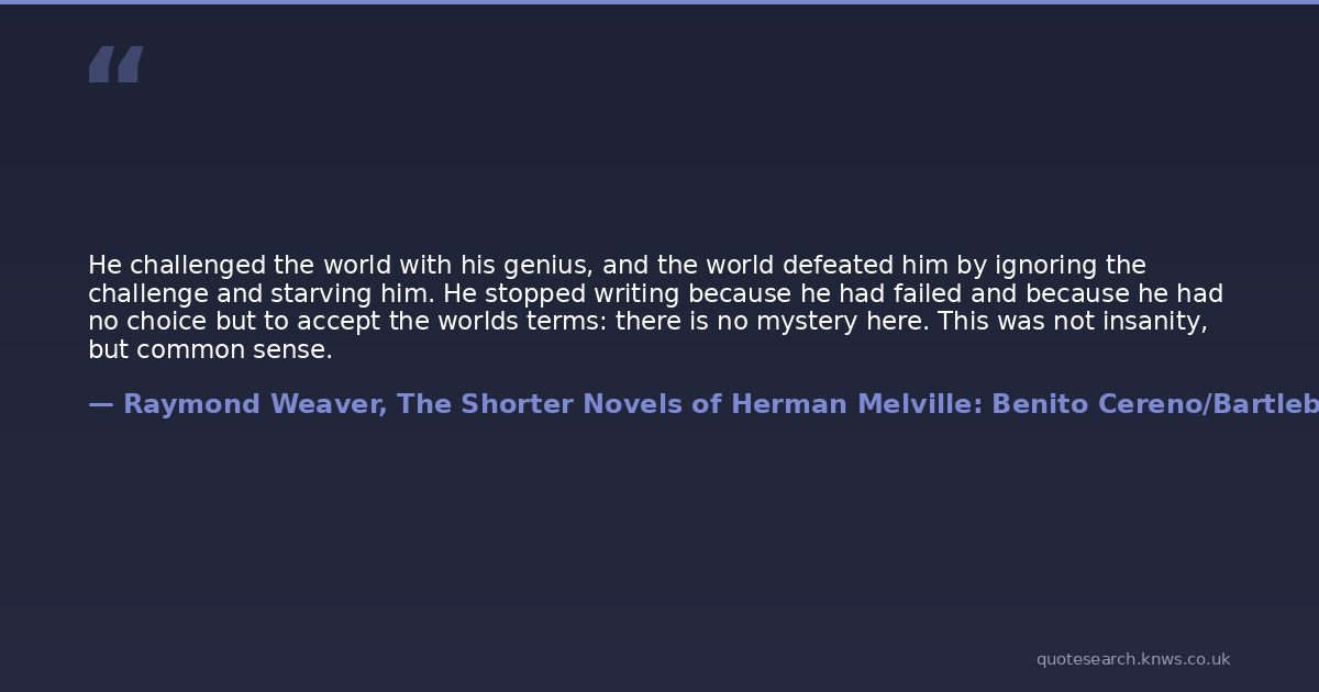 He challenged the world with his genius, and the world defeated him by ignoring the challenge and starving him. He stopped writing because he had failed and because he had no choice but to accept the worlds terms: there is no mystery here. This was not insanity, but common sense.