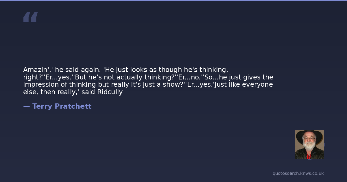 Amazin'.' he said again. 'He just looks as though he's thinking, right?''Er...yes.''But he's not actually thinking?''Er...no.''So...he just gives the impression of thinking but really it's just a show?''Er...yes.'Just like everyone else, then really,' said Ridcully