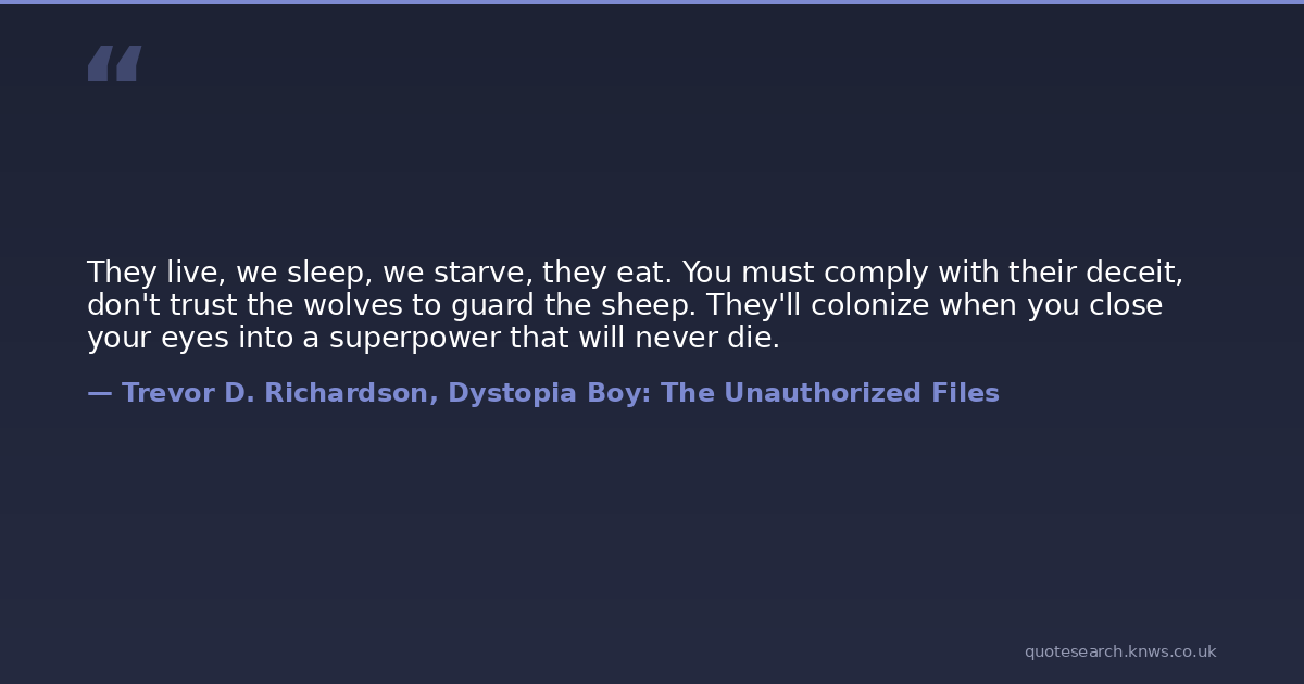 They live, we sleep, we starve, they eat. You must comply with their deceit, don't trust the wolves to guard the sheep. They'll colonize when you close your eyes into a superpower that will never die.