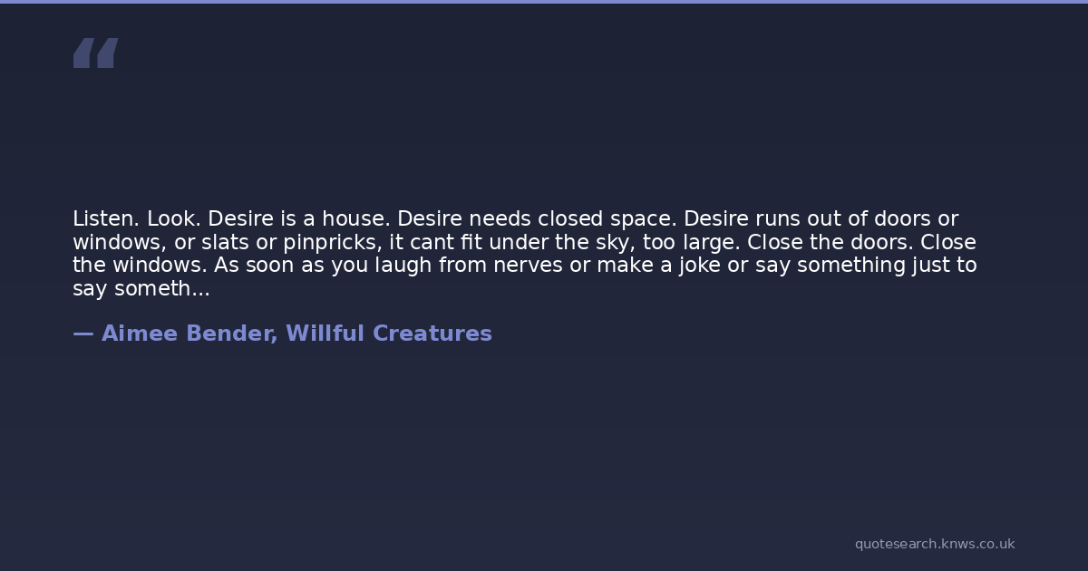 Listen. Look. Desire is a house. Desire needs closed space. Desire runs out of doors or windows, or slats or pinpricks, it cant fit under the sky, too large. Close the doors. Close the windows. As soon as you laugh from nerves or make a joke or say something just to say something or get all involved with the bushes, then you blow open a window in your house of desire and it cant heat up as well. Cold draft comes in.