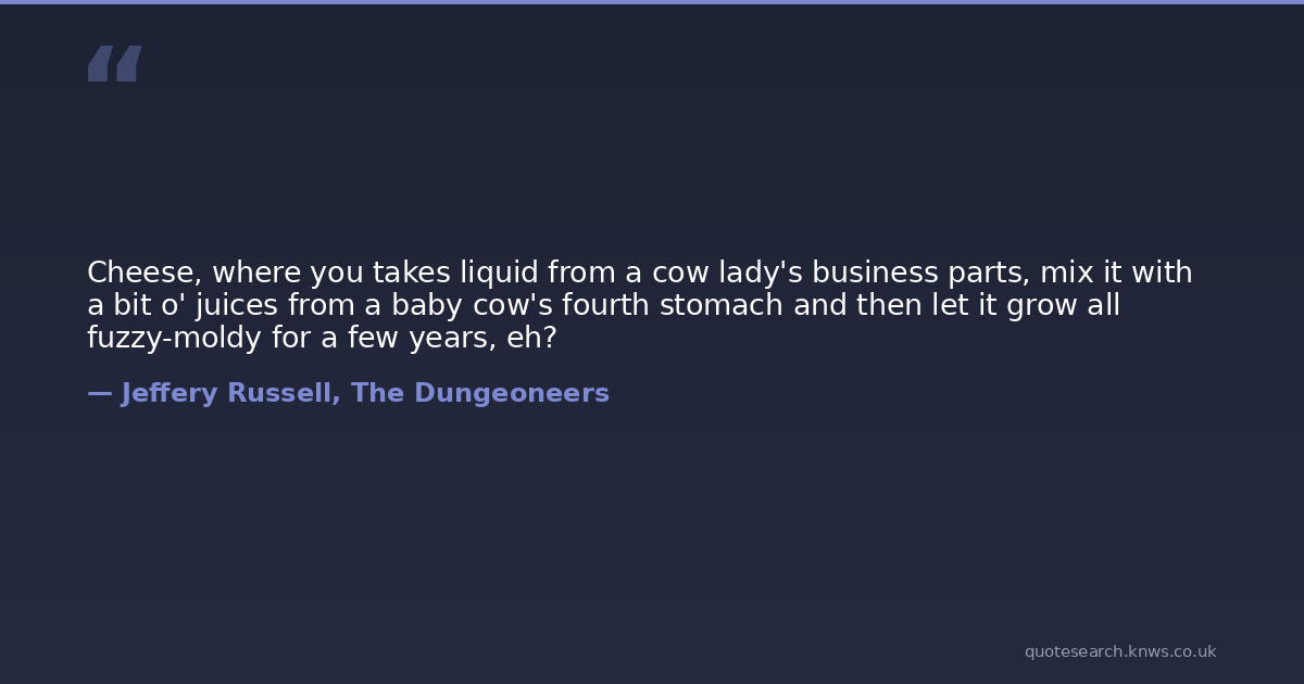 Cheese, where you takes liquid from a cow lady's business parts, mix it with a bit o' juices from a baby cow's fourth stomach and then let it grow all fuzzy-moldy for a few years, eh?