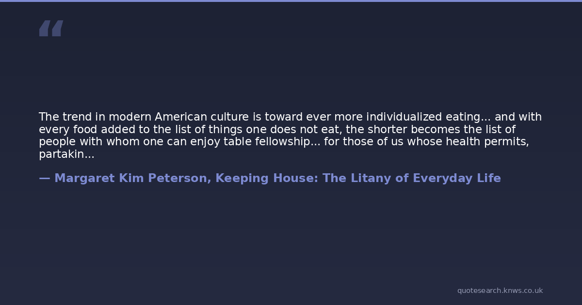 The trend in modern American culture is toward ever more individualized eating... and with every food added to the list of things one does not eat, the shorter becomes the list of people with whom one can enjoy table fellowship... for those of us whose health permits, partaking readily of whatever is offered can be a way of affirming that eating together is at least as important as whatever it is that is eaten.