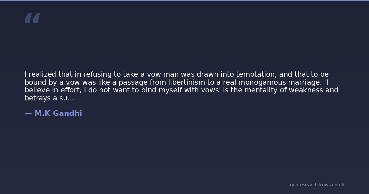 I realized that in refusing to take a vow man was drawn into temptation, and that to be bound by a vow was like a passage from libertinism to a real monogamous marriage. 'I believe in effort, I do not want to bind myself with vows' is the mentality of weakness and betrays a subtle desire for the thing to be avoided. Or where can be the difficulty in making a final decision? I vow to flee from the serpent which I know will bite me, I do not simply make an effort to flee from him. I know that mere effort may mean certain death. Mere effort means ignorance of the certain fact that the serpent is bound to kill me. The fact, therefore, that I could rest content with an effort only means that I have not yet clearly realized the necessity of definite action. 'But supposing my views are changed in the future, how can I bind myself by a vow?' Such a doubt often deters us. But that doubt also betrays a lack of clear perception that a particular thing must be renounced. That is why Nishkulanand has sung: 'Renunciaton without aversion is not lasting.' Where therefore the desire is gone, a vow of renunciation is the natural and inevitable fruit.