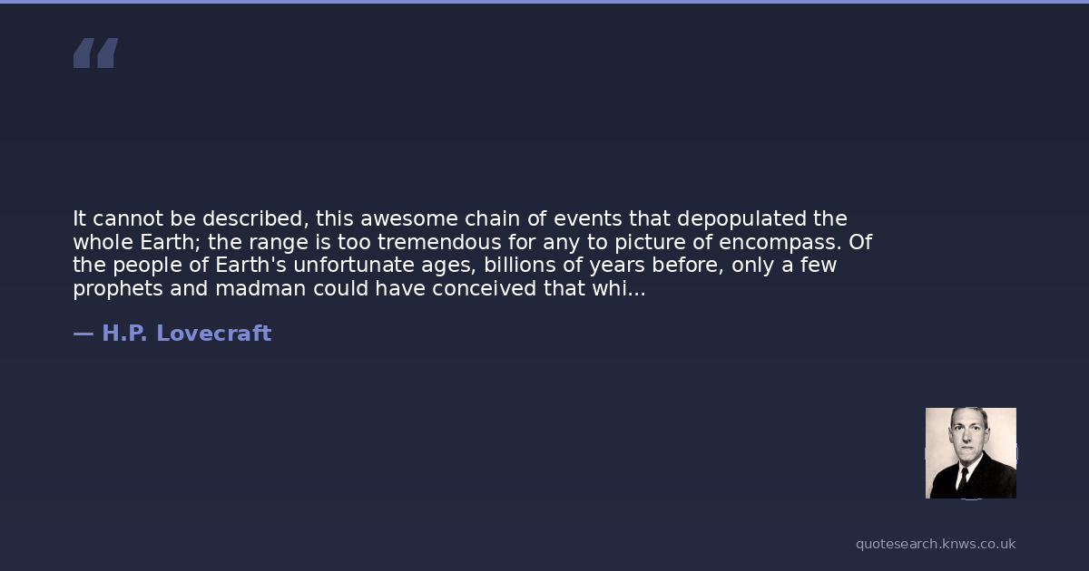 It cannot be described, this awesome chain of events that depopulated the whole Earth; the range is too tremendous for any to picture of encompass. Of the people of Earth's unfortunate ages, billions of years before, only a few prophets and madman could have conceived that which was to come - could have grasped visions of the still, dead lands, and long-empty sea-beds. The rest would have doubted... doubted alike the shadow of change upon the planet and the shadow of doom upon the race. For man has always thought himself the immortal master of natural things...