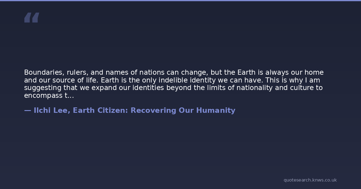 Boundaries, rulers, and names of nations can change, but the Earth is always our home and our source of life. Earth is the only indelible identity we can have. This is why I am suggesting that we expand our identities beyond the limits of nationality and culture to encompass the only identity that is definite and real by identifying ourselves, first and foremost, as Earth Citizens.