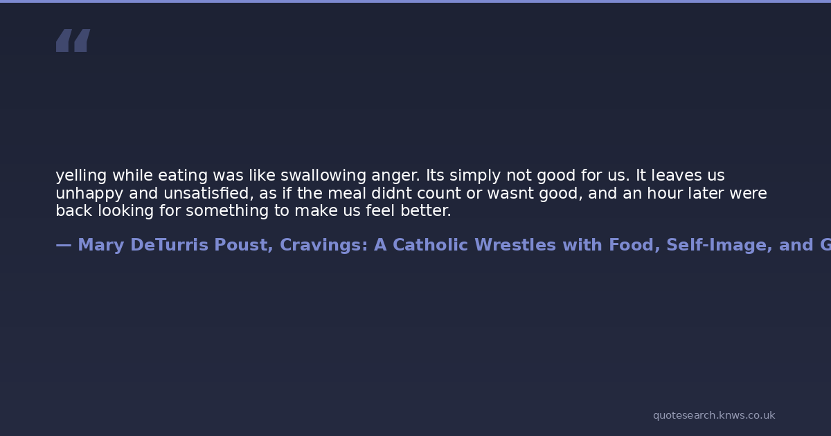 yelling while eating was like swallowing anger. Its simply not good for us. It leaves us unhappy and unsatisfied, as if the meal didnt count or wasnt good, and an hour later were back looking for something to make us feel better.