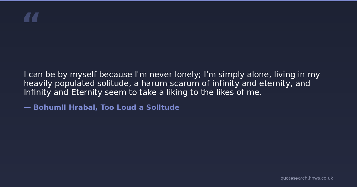 I can be by myself because I'm never lonely; I'm simply alone, living in my heavily populated solitude, a harum-scarum of infinity and eternity, and Infinity and Eternity seem to take a liking to the likes of me.