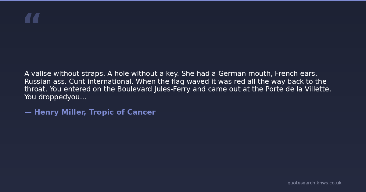 A valise without straps. A hole without a key. She had a German mouth, French ears, Russian ass. Cunt international. When the flag waved it was red all the way back to the throat. You entered on the Boulevard Jules-Ferry and came out at the Porte de la Villette. You droppedyour sweetbreads into the tumbrils red tumbrils with two wheels, naturally. At the confluence of the Ourcq and Marne, where the water sluices through the dikes and lies like glass under thebridges.