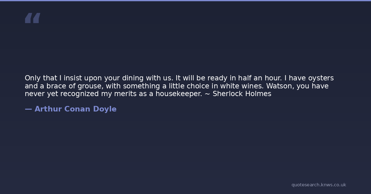 Only that I insist upon your dining with us. It will be ready in half an hour. I have oysters and a brace of grouse, with something a little choice in white wines. Watson, you have never yet recognized my merits as a housekeeper. ~ Sherlock Holmes