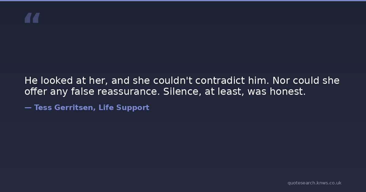 He looked at her, and she couldn't contradict him. Nor could she offer any false reassurance. Silence, at least, was honest. honest silence Download Image Share on X Share on Facebook Copy Link