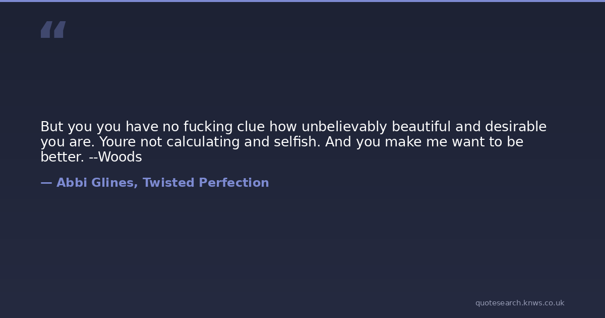But you you have no fucking clue how unbelievably beautiful and desirable you are. Youre not calculating and selfish. And you make me want to be better. --Woods
