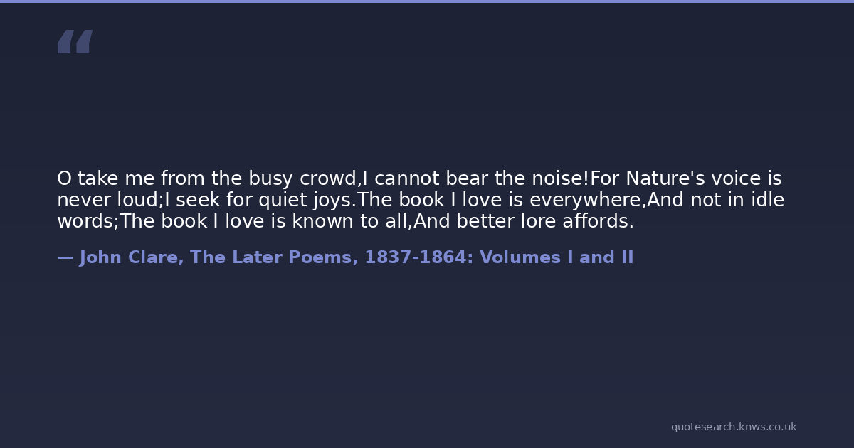 O take me from the busy crowd,I cannot bear the noise!For Nature's voice is never loud;I seek for quiet joys.The book I love is everywhere,And not in idle words;The book I love is known to all,And better lore affords.